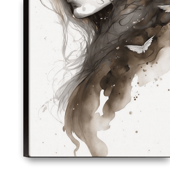 Aquarel portret van een vrouw in bruin, grijs en koper tinten.