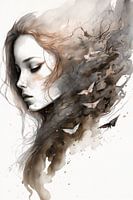 Aquarel portret van een vrouw in bruin, grijs en koper tinten.