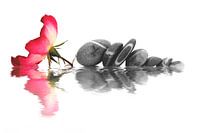 Compsoition de fleur et galets sur fond blanc. Ajout de reflets.