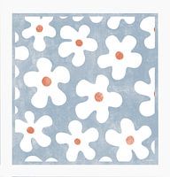 Deze bloemen zijn gemaakt in pastel blauw, met als contrast een hart van oranje/rood. De bloemen wisselen elkaar af op een blauw vierkant, met een witte achtergrond. Vormgegeven in een modern en minimalistische stijl met textuur.