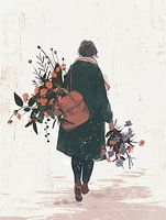 Vrouw loopt naar huis nadat ze bloemen heeft gekocht