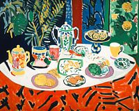 Dit fleurige eetkamer stilleven in expressionistische stijl toont een gedekte tafel met een theepot, schalen met koekjes en planten. Het schilderij ademt een semi-klassieke sfeer uit.