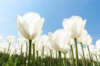 Witte zonnige tulpen groeien in de Polder op akkerbouwgrond tegen blauwe lucht. Groothoek opname van dichtbij in kikvors perspectief tijdens het voorjaar.