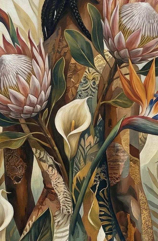 Dit opvallende en sfeervolle kunstwerk toont een vrouw met dreadlocks, op de rug gezien, omringd door weelderige, tropische vegetatie en exotische bloemen.