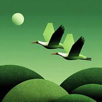Surrealistisch en sereen digitaal kunstwerk van twee elegante kraanvogels in harmonieuze vlucht met gespreide vleugels, zwevend boven een golvend landschap van ronde, diepgroene heuvels onder een heldere volle maan in een smaragdgroene hemel.