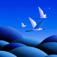 Dit betoverende en meditatieve digitale kunstwerk toont drie elegante witte vogels die gracieus zweven boven een surrealistisch landschap van grote, ronde, gladde heuvels in verschillende tinten diepblauw. De vogels hebben zwarte snavels en zweven in formatie, met vleugels uitgespreid in een vloeiende, bijna dansende beweging.…