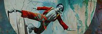 Floating Silence - Dit surrealistische schilderij toont een clown met bleek gezicht en dramatisch rood-zwarte oogmake-up, zwevend tegen een achtergrond van abstracte, blauwgroene vormen en ondefinieerbare figuren.