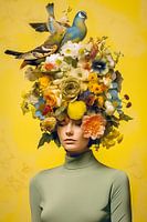Wat echter het meest fascineert, zijn de vogels die zich op haar hoofd hebben genesteld. Hun veren lijken in harmonie te resoneren met de tinten van de bloemen. Dit geheel straalt een sfeer uit van vreugdevolle kalmte.