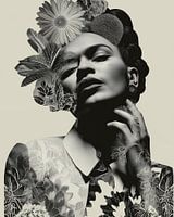 Een opvallend zwart-wit portret waarin botanische vormen samensmelten met de figuur, waardoor de grens tussen menselijke aanwezigheid en de natuur vervaagt. Hoog contrast en delicate texturen roepen stilte, intimiteit en een gevoel van tijdloze elegantie op.