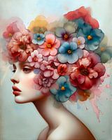 Een portretkunstwerk genaamd Flora's Flower Fantasy uitgevoerd in pastelkleuren roze, geel, groen, koper, brons, turquoise, bruin, zwart, beige, ivoor en oker waardoor een prachtig kleurenschema ontstaat. Moderne fantasiekunst.