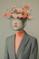 Dit intrigerende werk balanceert op het snijvlak van surrealisme en modefotografie. Het beeld toont een figuur in een klassieke grijze blazer met een perzikkleurige coltrui, maar het hoofd is vervangen door een glazen vissenkom. In deze bol groeien weelderige bloemen – zachte roze rozen en vurige oranje bloemen – die als een uitbundige tuin uit het hoofd ontspruiten. Deze samensmelting van mens en natuur roept vragen op over identiteit, kwetsbaarheid en de groei van gedachten.