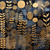 Collage van botanische vormen in een harmonieus palet van goud en marineblauw. Een viering van de natuur, vastgelegd in een statische, bijna ceremoniële compositie. De verscheidenheid aan plantmotieven, van gestileerde bladeren tot abstracte bloemfiguren, suggereert een onderliggende orde en ritme.