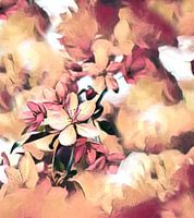Abstract bloesem schilderij. Mixed media kunst in voornamelijk bordeauxrood en okergele tinten