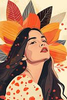 Illustratie van een aquarel gemixt met popart waarin een vrouw met lang haar en een grote bloem achter haar oor te zien is. De afbeelding heeft gedurfde contouren en vlakke kleuren, kenmerkend voor een levendige stijl. Met behulp van vlakke schaduwen, eenvoudige vormen en het gebruik van een gedurfd kleurenpalet wordt een opvallende uitstraling gecreëerd. De hoge contrasten en speelse rangschikking zorgen voor een unieke visuele impact.