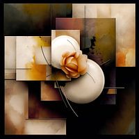 Abstracte gelaagde collage in warme sfeervolle aardetinten met een roos, goudkleurige accenten en een grove steen structuur.