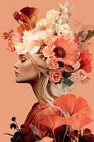 Een betoverend portret waarin een vrouwelijk profiel opgaat in een weelderige cascade van bloemen en bladeren in warme roze- en koraaltinten. Het kunstwerk smelt menselijke schoonheid samen met botanische elegantie, waar gedachten zichtbaar worden als delicate bloemsels die uit haar gedachten voortkomen. Het subtiele kleurenpalet en de…