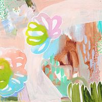 'Floral Dreams' is een schilderij met abstracte bloemen in groene, bruine, turkooise en roze tinten. Het heeft een dromerige sfeer en voegt een ontspannen, fantasierijke touch toe aan je ruimte. Perfect om je muur op te fleuren met wat rust en kleur.
