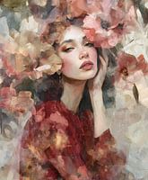 Portret van een mooie vrouw in een rode blouse met delicate gelaatstrekken, rode lippen en mysterieuze ogen. Ze wordt omringd door bloemen, geschilderd met zichtbare penseelstreken en textuur, tegen een lichtbruine achtergrond met zachte belichting en warme tinten.