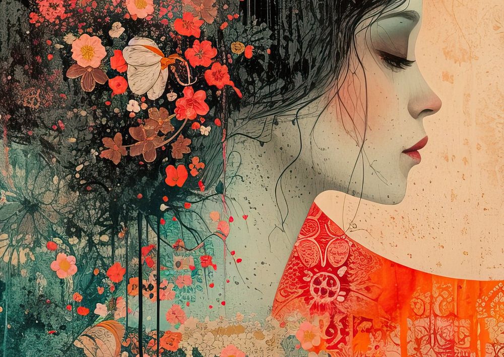 Details: abstract, vrouw, bloemen, silhouet, modern, kleurrijk, kunst, portret, bloesems, flora