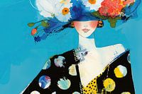 Floral Essence - Dit vrouwen schilderij kenmerkt zich door een elegante dame met een flamboyante hoed versierd met levendige, abstract geschilderde bloemen op een achtergrond van helder blauw.