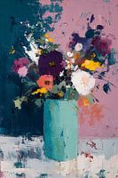 Een expressief abstract bloemstilleven waarin een turquoise vaas gevuld is met een uitbundig boeket van paarse, witte en gele bloemen. De losse penseelstreken en het kleurrijke palet creëren een dynamische compositie tegen een achtergrond die overgaat van diep turquoise naar zacht roze, waarbij de witte basis voor een frisse moderne…