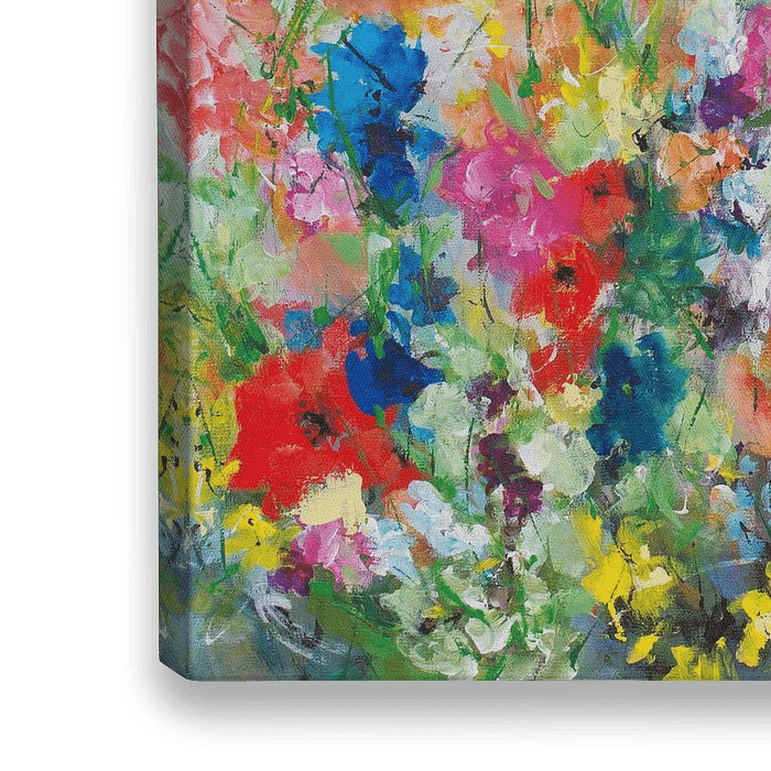 'Floral Feast' is een uitstapje van mijn abstractere schilderwerk, dat evengoed vaak aan bloemen doet denken. Dit keer heb ik expliciet gekozen voor een bloemenschilderij. Met een laag perspectief, alsof je in een zomerse bloemenweide ligt. Met dit schilderij tover je elk saai hoekje in huis om tot een fijne plek om weg te dromen. Denkend aan liggen in het gras in de zon, de wolken voorbijdrijvend en de kleurrijke veldbloemen als een wild boeket boven je uit torenend.