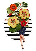 In dit kunstwerk is de schoonheid van de natuur en de vrouwelijke elegantie gecombineerd. De levendige, gedetailleerde weergave van de bloemen staat in sterk contrast met het grafische zwart-witpatroon op de achtergrond.