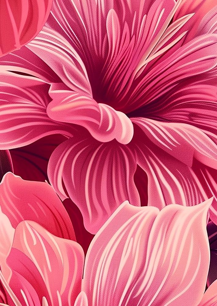 Een gedurfd en levendig patroon van grote, gestileerde bloemen in roze tinten siert een rode achtergrond. Het ontwerp springt direct in het oog door het contrast tussen de heldere roze bloemblaadjes en de dieprode stof, wat een sfeer oproept die doet denken aan vintage mode.