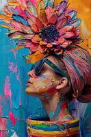 Kleurrijke afbeelding van een prachtige vrouw. Kleurrijke bloemen groeien vanuit een stevige bodem in de bloempot. Mooie complementerende kleuren in hoofddoek, pot, bloemen, achtergrond en gezicht. Blauw, geel, rood, roze, groen, paars. Versmelting van kleuren en mens en bloem. Passend bij diverse stijlen en trends, waaronder Modern Abstract, bloemen, kleurrijk, lente, zomer, portret. Artist: Bianca ter Riet.