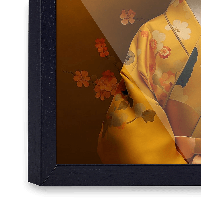 Een vrouw gekleed als Geisha in een satijnen gele kimono en bijpassend hoofddeksel poseert tegen een achtergrond versierd met oranje bloemenpatronen. De algehele toon is warm, met ingewikkelde details die de bloesems en traditionele kledij benadrukken.