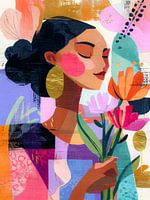 Een krachtig portret waarin vrouwelijkheid, natuur en expressieve kleuren samensmelten tot een levendige ode aan het leven. De bloemen in haar hand en het serene gezicht vol zelfliefde maken dit werk tot een visuele meditatie op schoonheid, zachtheid en identiteit. Geïnspireerd door moderne collagekunst en symbolische vormen, straalt…