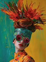 Kleurrijk portret in geel, groen, rood en bruin van een mooie vrouw met haarband waaruit bloemen te voorschijn komen. Ze droomt van de zomer en bloemen en dat weerspiegelt in haar ziel via haar ogen. De achtergrond is verdeeld in twee strakke vlakken in dezelfde kleurstellig als de prachtige vrouw. Passend bij diverse stijlen en trends, waaronder kleurrijk, Modern Abstract, Bloemen, Portretten, Vrouwen. Artist: Bianca ter Riet True Joy