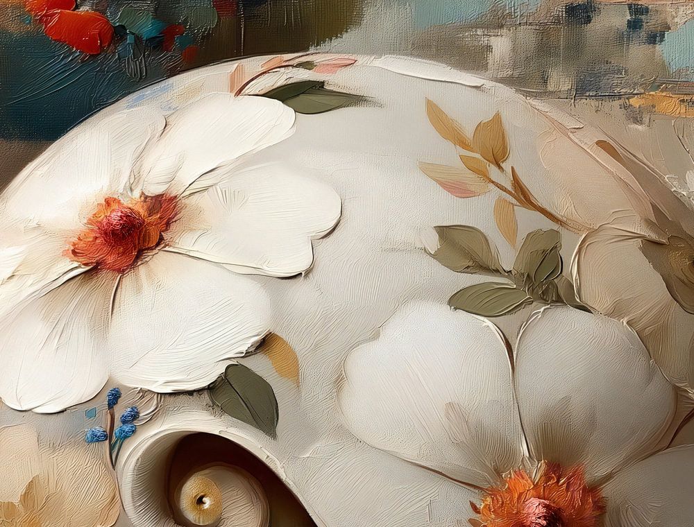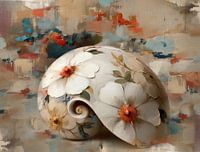Zeeschelp met bloemetjes in zachte naturel tinten.