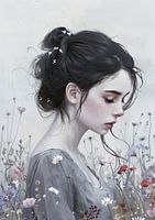 Floral Serenity Gaze - Dit portret schilderij toont een jonge vrouw met donker haar in een losse knot, versierd met kleine witte bloemen, kijkend naar beneden met gesloten ogen tegen een delicate achtergrond van diverse veldbloemen.