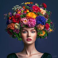 In Queen of Petals komt de betovering van vrouwelijke kracht en natuurlijke pracht samen in één iconisch beeld. Deze digitale compositie toont een jonge vrouw met een intense blik, omlijst door een majestueuze krans van bloemen in rijke, volle kleuren: koninklijk blauw, fluweelachtig rood, zonnig geel en zachtroze. De bloemen zijn zo gedetailleerd uitgewerkt dat ze bijna tastbaar zijn — een knap staaltje digitale kunst dat balans vindt tussen realisme en dromerigheid.