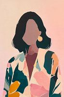 Een minimalistisch digitaal kunstwerk dat een abstracte silhouet toont tegen een zachtroze achtergrond. De figuur draagt een weelderig gestileerd kledingstuk in een harmonieus samenspel van teal, roze en oranje tinten, met een vloeiende botanische print. Het werk straalt een moderne, feminine energie uit met een verfijnde balans tussen…