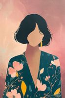 Een illustratie in een modern minimalistische stijl toont een elegant silhouet met een kort bobkapsel, gouden oorbellen en een prachtig turquoise gewaad met roze bloemen en gouden accenten. De zachte roze achtergrond en de vloeiende lijnen creëren een tijdloos portret dat mode, natuur en verfijning samenbrengt.