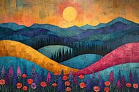 Details: landschap, bloemen, zon, kleurrijk, abstract, modern, canvas, natuur, kunst, bergen