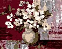 Floral Vibe - Dit bloemen schilderij toont een stijlvolle vaas met een overvloed aan witte bloemen, omringd door een rijke, bordeauxrode achtergrond die de natuurlijke schoonheid van de bloesems accentueert.