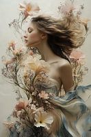 Dit surrealistisch digitaal kunstwerk verbeeldt een etherische fusie van vrouw en natuur. Een jonge vrouw met gesloten ogen wordt omringd door delicate bloemen die naadloos overvloeien in haar golvende haren en lichaam. De zachte, pastelachtige kleurtonen creëren een dromerige sfeer, terwijl de vloeiende lijnen van haar en bloemen een gevoel van beweging en transformatie oproepen. Het portret straalt een serene kracht uit, waarbij de grens tussen menselijk en botanisch vervaagt, wat leidt tot een visueel betoverende exploratie van de verbondenheid tussen vrouwelijkheid en de natuurlijke wereld.