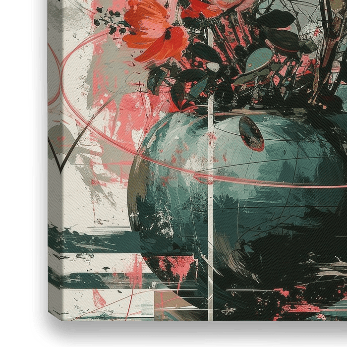 Dit digitale kunstwerk van René van den Berg is een abstract stilleven dat uitblinkt in zijn vermogen om de wildheid van de natuur te vangen binnen de context van gestileerde compositie. Een ronde vaas met een reflecterende aquamarijn glazuur herbergt een uitbundig boeket van bloemen in vurige tinten van koraal en zachtroze, omgeven…