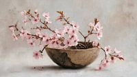 Zachte, minimalistische bloemencompositie die Japanse esthetiek combineert met rustige natuurlijke tinten, eenvoudige vormen en uitgebalanceerde negatieve ruimte, waardoor een serene, moderne en tijdloze botanische harmonie ontstaat.