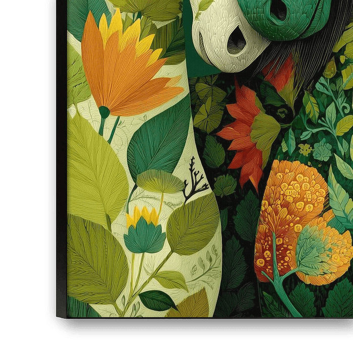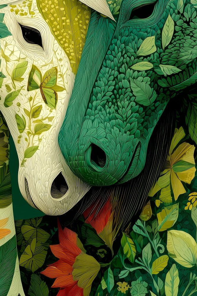 Dit schilderij toont twee paarden die liefdevol met hun hoofden tegen elkaar leunen, alsof ze in stilte verbonden zijn. Beide paarden zijn volledig opgebouwd uit verfijnde, botanische patronen. Het linker paard heeft een lichte, crèmekleurige basis met bladeren en bloemen in zachte groentinten en warme oranje accenten. Het rechter paard bestaat uit diepere groentinten, rijk aan bladstructuren en florale details, versierd met heldere gele bloemen die oplichten tegen de donkere achtergrond. De achtergrond is donker en rustig, waardoor de kleurrijke plantenmotieven op de paarden sterk naar voren komen. Het geheel geeft een gevoel van harmonie tussen natuur, rust en verbondenheid.