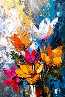 Het gebruik van olieverf is duidelijk robuust en expressief, met dikke, rijke lagen die de bloemblaadjes en bladeren vormgeven. Het kleurenschema is levendig, met tinten van goud, oranje en roze die sterk afsteken tegen de donkerblauwe en grijze achtergrond. De gouden accenten geven het werk een gevoel van luxe en warmte. De compositie lijkt bijna in beweging, met penseelstreken die de dynamische en ongetemde natuur van de bloemen weerspiegelen. Dit kunstwerk straalt een krachtige levensenergie uit en zou een gevoel van vreugde en optimisme in elke ruimte kunnen brengen.
