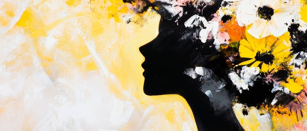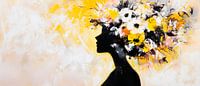 Een fascinerend samenspel van zwarte en levendige geeltinten ontvouwt zich in deze artistieke compositie. Het silhouet van een vrouw, bekroond door een explosieve bloemenpracht, wekt een indruk van creativiteit en levensvreugde. Deze harmonieuze mix is perfect als blikvanger in de woonkamer of creatieve ruimte om inspiratie en positieve energie te bevorderen.