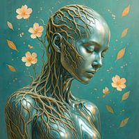 Dit stille icoon, gevangen in iriserend turquoise en metallic glans, lijkt uit een andere dimensie te komen - een wereld waarin de grenzen tussen organisch leven en kunstmatige intelligentie allang vervaagd zijn. Haar lichaam lijkt op een sculptuur van vloeibaar staal, koel en perfect, maar toch doorkruist door wortels die als aderen over haar huid lopen en diep uit een innerlijke kern van de natuur lijken te komen.