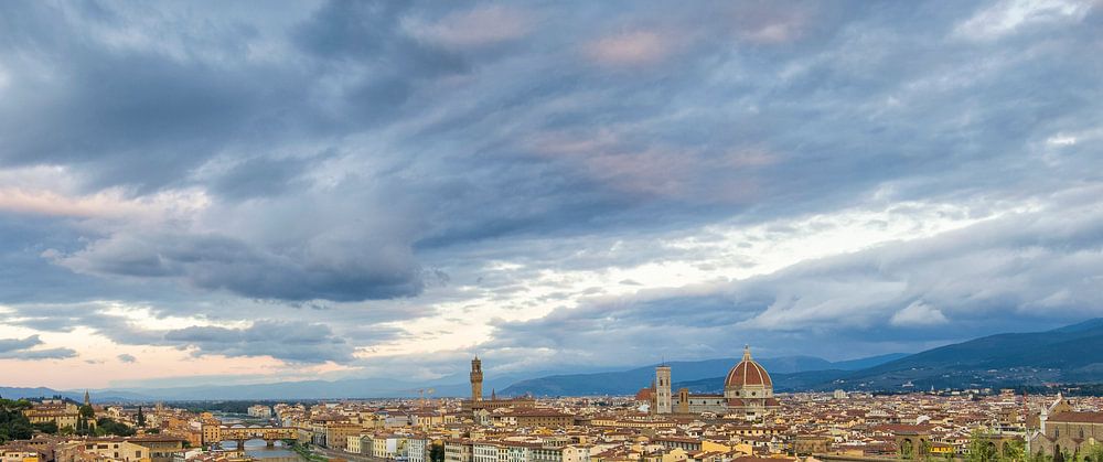 Blik op Florence tijdens het gouden uur, vroeg in de ochtend, vanaf het monument van Michelangelo, waardoor duidelijk is hoe de rijke stad, bekend van de vele kunstenaars, gelegen is tussen de toscaanse heuvels.