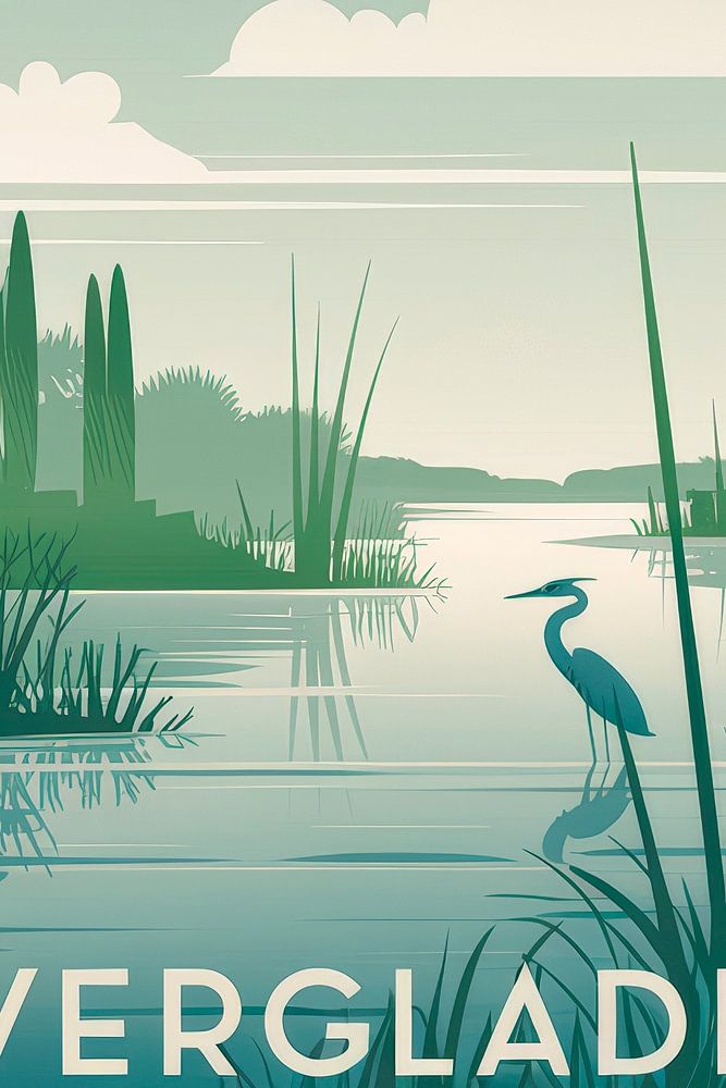 Een rustige ochtend in het Everglades National Park ontvouwt zich tegen een vredige achtergrond van zacht groen en kalm water. Een eenzame reiger staat majestueus in het water, omringd door weelderige vegetatie en een bewolkte hemel. Deze ervaring van rust en natuur past perfect bij een woonkamer die ontspanning en inspiratie uitstraalt.