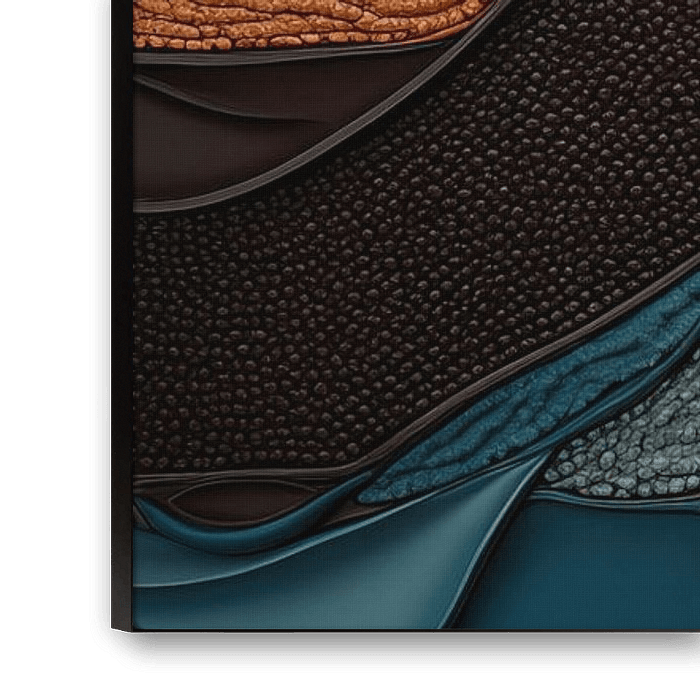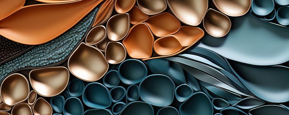 Abstracte collage van verschillende kleurrijke stoffen en texturen in rijke aardetinten en blauwgroen in een golvend patroon met sterke contrasten op de grensvlakken.