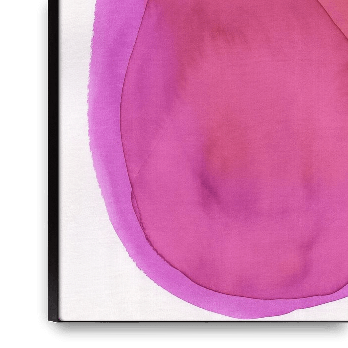 De transparante lagen ecoline vloeien hier in elkaar als zachte golven, in een verticale beweging. De kleuren roze, paars en oranje overlappen en vormen een harmonieus geheel, alsof ze langzaam opstijgen of in elkaar rusten.